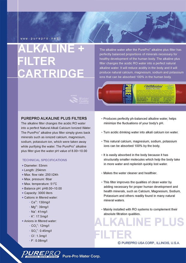 The Alkaline filter changes the acidic RO water into a perfect Natural Alkali Calcium Ionized Water. The PurePro® Alkaline+ filter simply gives back minerals such as ionized calcium, magnesium, sodium, potassium ion, which were taken away while purifying the water. The PurePro® Alkaline+ filter is effective and give the water pH value of 8.50~10.00