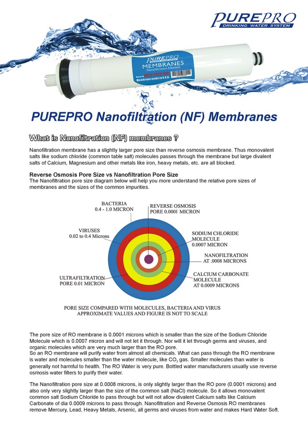 The Nanofiltration pore size at 0.0008 microns, is only slightly larger than the RO pore (0.0001 microns) and also only very slightly larger than the size of the common salt (NaCl) molecule. So it allows monovalent common salt sodium chloride to pass through but will not allow divalent calcium salts like calcium carbonate of dia 0.0009 microns to pass through. Nanofiltration and Reverse Osmosis RO membranes remove Mercury, Lead, Heavy Metals, Arsenic, all germs and viruses from water and makes hard water soft. Nanofiltration (NF) Membrane VS reverse osmosis membrane Catalogue