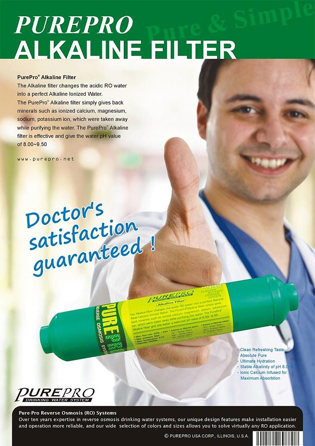The Alkaline filter changes the acidic RO water into a perfect Alkaline Ionized Water. The PurePro® Alkaline filter simply gives back minerals such as ionized calcium, magnesium, sodium, potassium ion, which were taken away while purifying the water. Produces alkaline water which helps your body maintain a healthy pH level. The PurePro® Alkaline filter is effective and give the water pH value of 8.00~9.5