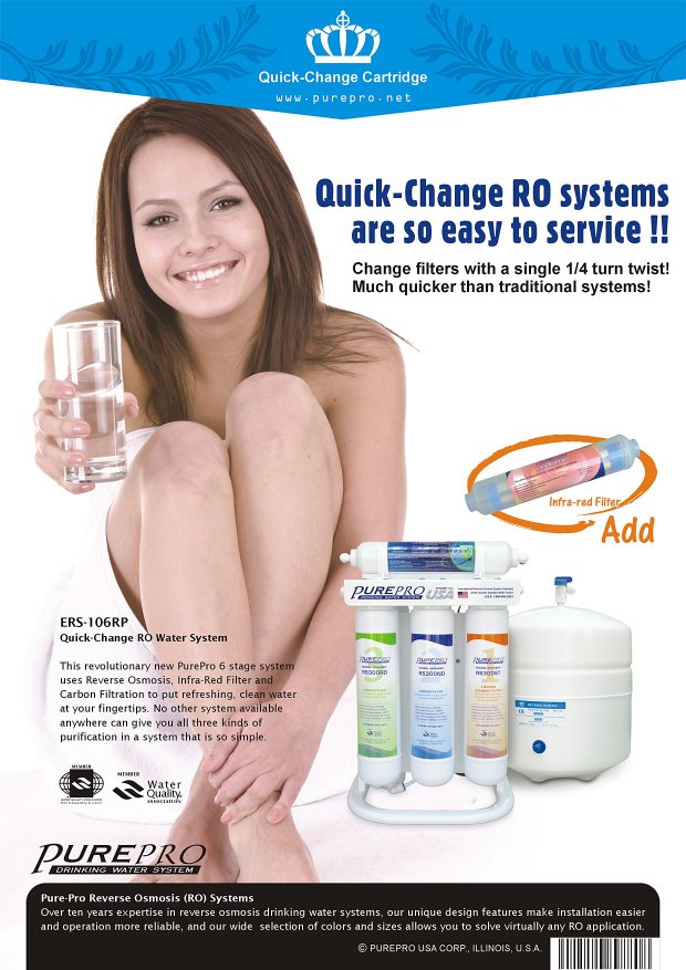 PurePro® Quick-Change RO system uses the most advanced water treatment technology: "Reverse Osmosis". Reverse Osmosis (RO) is recognized as one of the best available technologies for producing best quality drinking water. It's also the same method used by many bottled water companies to make safe and great tasting water.  No other home water treatment system can offer you as much protection and reliability.