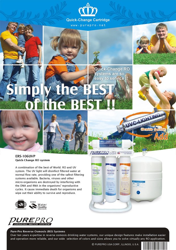 PurePro® Quick-Change RO system uses the most advanced water treatment technology: "Reverse Osmosis". Reverse Osmosis (RO) is recognized as one of the best available technologies for producing best quality drinking water. It's also the same method used by many bottled water companies to make safe and great tasting water.  No other home water treatment system can offer you as much protection and reliability.