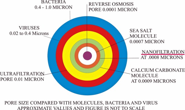 The Nanofiltration pore size at 0.0008 microns, is only slightly larger than the RO pore (0.0001 microns) and also only very slightly larger than the size of the common salt (NaCl) molecule. So it allows monovalent common salt sodium chloride to pass through but will not allow divalent calcium salts like calcium carbonate of dia 0.0009 microns to pass through. Nanofiltration and Reverse Osmosis RO membranes remove Mercury, Lead, Heavy Metals, Arsenic, all germs and viruses from water and makes hard water soft.