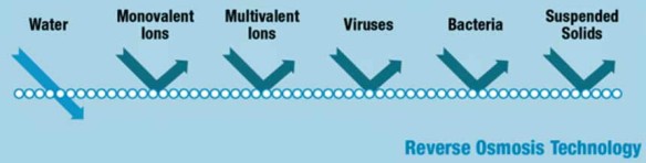The pore size of RO membrane is 0.0001 microns which is smaller than the size of the Sodium Chloride Molecule which is 0.0007 micron and will not let it through. Nor will it let through germs and viruses, and organic molecules which are very much larger than the RO pore.
